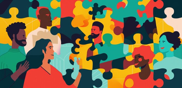 Diverse group of people interacting through colorful puzzle pieces representing unity and collaboration. Team building, social connection, inclusivity, diversity, teamwork concept.