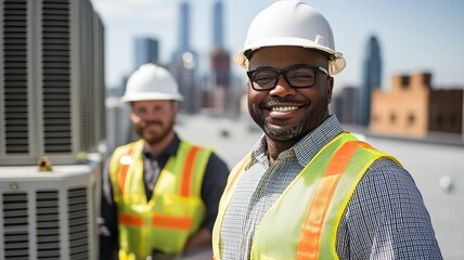 Engineers Analyzing Data on Factory Control System. Two engineers in hard hats analyzing data on a factory control system, focused on efficiency and accuracy in manufacturing processes.