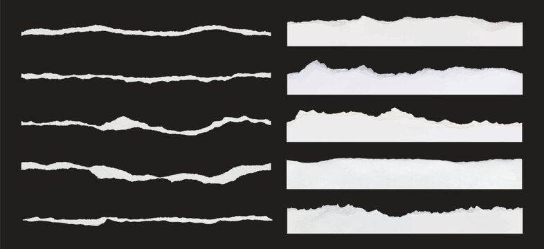 Set of torn paper edges on black background. Torn paper texture, torn paper strips, torn paper lines. Perfect for design projects, scrapbooking, and crafts. Ripped element set. Vectors.