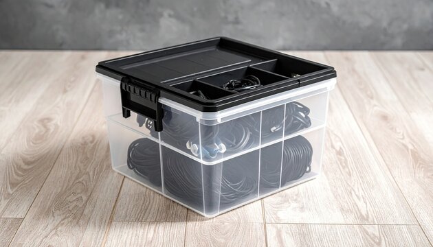 Clear plastic storage box filled with cables