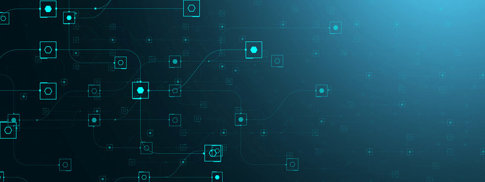 Business technology Digital cyberspace concept, innovation thinking brainstorming idea, flow chart line art abstract illustration blue banner background.