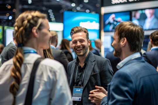 Group of professionals chat and laugh at trade show, with one man in his thirties smiling among colleagues, against backdrop of display lights.