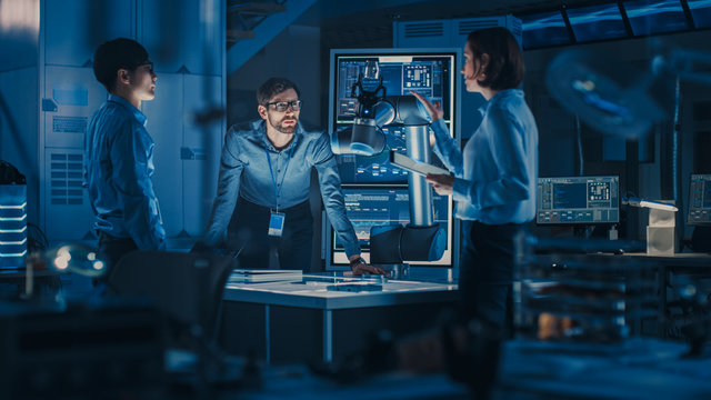 Diverse Team of Engineers with Laptop and a Tablet Analyse and Discuss How a Futuristic Robotic Arm Works and Moves a Metal Object. They are in a High Tech Research Laboratory with Modern Equipment.