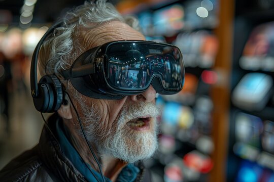 Senior Technology Interaction - Virtual Reality A senior man exploring virtual reality at a tech store, with an expression of amazement and curiosity. The image should emphasize the engagement with
