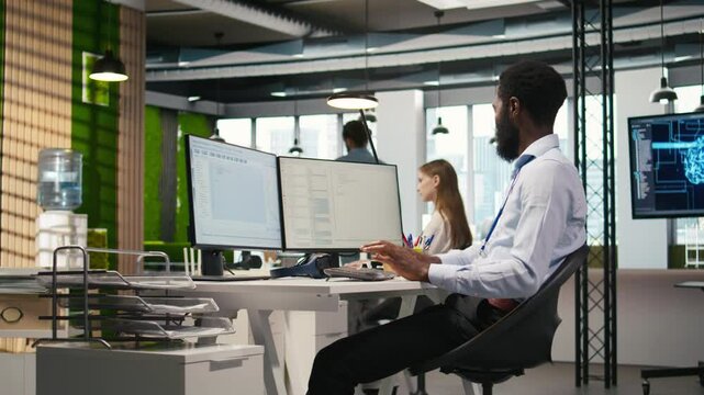 Focused man looks intently at computer screen displaying complex code. Close-up view shows concentrated expression. Indoor setting. Man likely programmer tech pro. Modern tech ambiance with strong