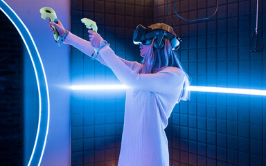 3d technology abstract neon light background, empty space scene, spotlight, dark night, virtual reality, cyber futuristic sci-fi background, street floor studio for mock up. colored geometric.