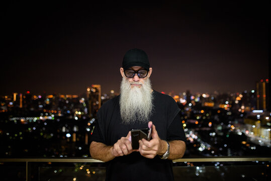 Portrait of mature man with gray beard outdoors at night using phone