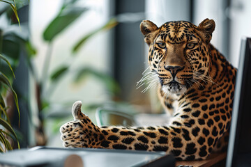 A leopard (tech guru) fixing a computer problem for a stressed-looking lion (businessman) in a technological savanna landscape.
