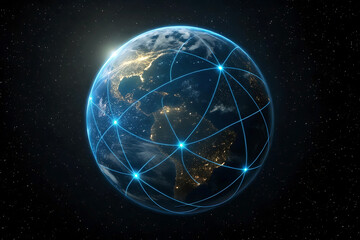Global communication network illustrated with earth in space and glowing connections emphasizing global connectivity for business solutions and advanced technology systems