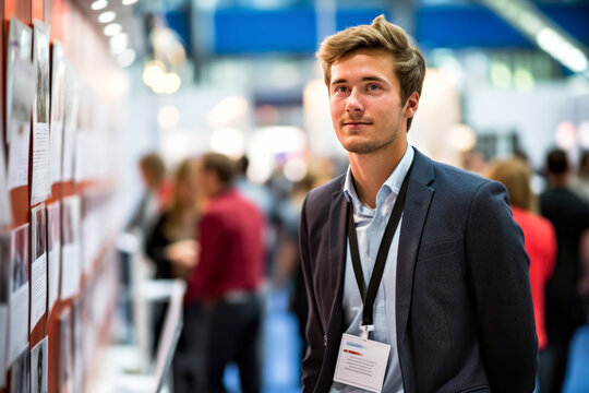 Young adult man IT recruiter at a job fair, focused on identifying and guiding job seekers in the tech industry towards promising careers. Concept of Labor Day