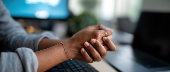 Anxious African American woman clasped hands at her desk in the office, feeling stressed and overwhelmed while working on a computer, concept of mental health and work life balance