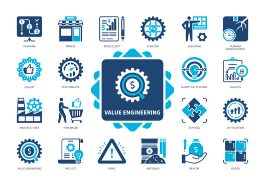 Value Engineering icon set. Planned Obsolescence, Performance, Reduce Cost, Materials, Manufacturer, Purchaser, Function, Quality, Optimization. Duotone color solid icons
