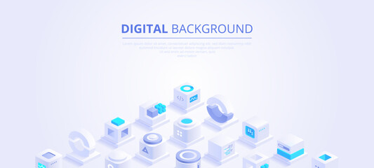 Web banner design of digital technologies concept. Abstract isometric cubes with text place on white background. Online communication and blockchain. Vector illustration of advertising landing page