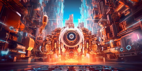3D render AI robot in factory production line. Engineering smart factory automated machine AR augmented reality technology futuristic industry technology robot arm control future industrial concept