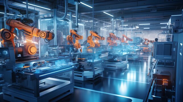 High tech manufacturing facility with cutting automation technology. New generation technology in action with robotic arms and automated machines working seamlessly in a modern industrial environment.