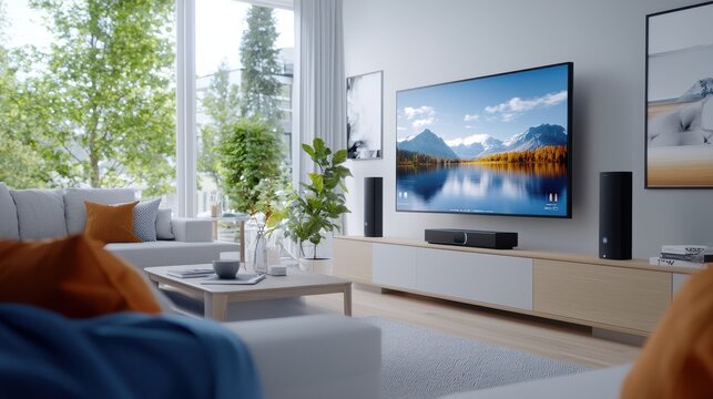 Cozy and modern tech savvy living room with a large digital screen displaying a serene outdoor landscape scene  The room features comfortable furniture sleek design and an airy bright atmosphere