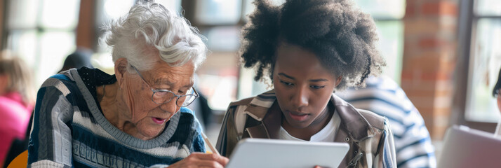 a tech-savvy senior learning to use a tablet with the help of a young volunteer