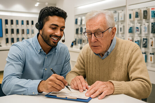 Adult son teaching elderly father modern tech, family connection, generational learning, digital inclusion, bridging the generation gap.