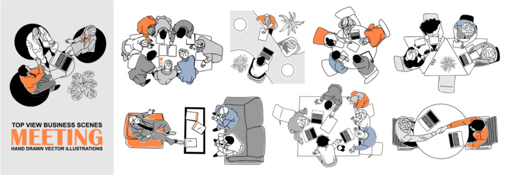 Business meeting top view illustrations. Business scenes of different men and women working together overhead view. Modern vector simple outline drawings Isolated