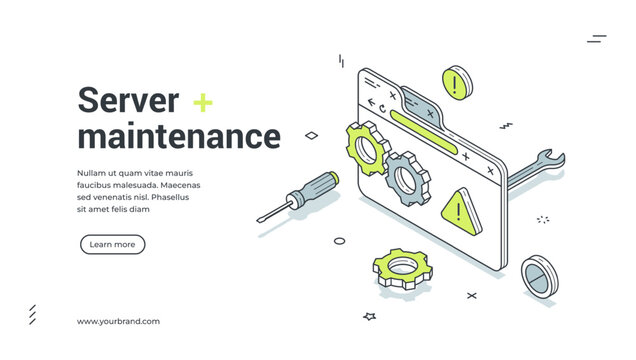 Computer server maintenance hardware support isometric web banner design template vector illustration. Digital software repairing analyzing examining network protection digital technology