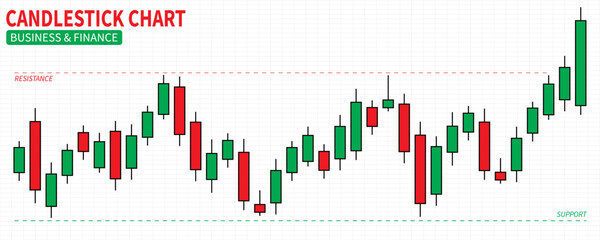 Candlestick Financial graph online trading with support and resistance levels, Stock Investment strategies, Buy and Sell Signals, Forex exchange market, Cryptocurrency, advertising design, vector.