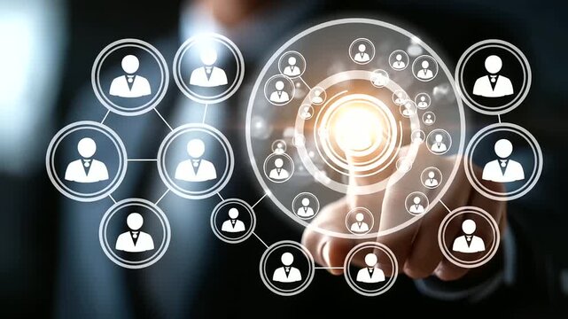 A businessman pressing a glowing virtual button surrounded by HR icons silhouettes representing recruitment and team building atmosphere of growth talent management and profess