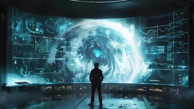 Female Senior Data Scientist Reviewing Reports Of Risk Management Department On Big Digital Screen In Monitoring Room. Diverse Consulting Company Employees Working Behind Desktop, Generative AI
