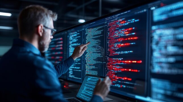 Confident Male Data Scientist Works on Personal Computer in Big Infrastructure Control and Monitoring Room with Neural Network. Young Engineer in an Office Room with Colleagues.