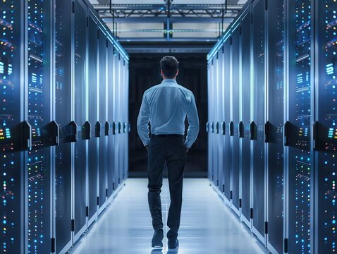 Data center technician inspects servers in server room. Person in blue shirt assesses computer hardware, data storage. specialist works on data security, information technology, computer network