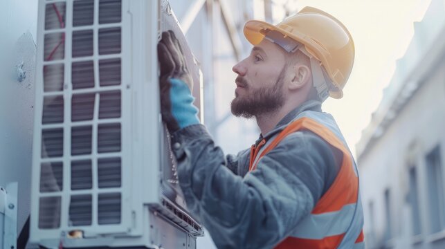 Detailed work by technician replacing old HVAC unit with new, improving home comfort and reliability. HVAC service technician. Copyspace