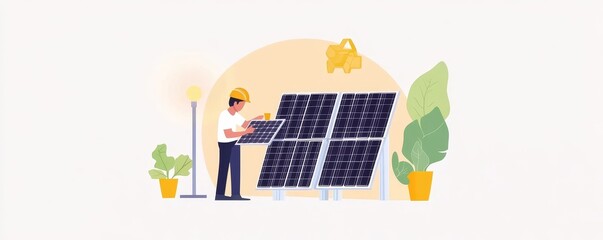 Professional worker installing solar panel under blue sky promoting renewable energy