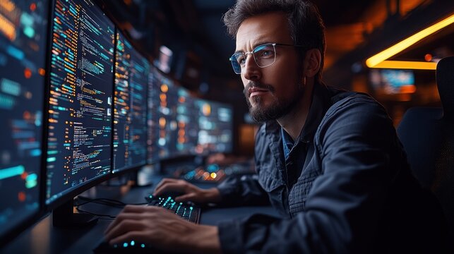IT Technician or System Administrator Working at Desk with Multiple Monitors | Network Engineer Maintaining Servers and Cybersecurity Infrastructure