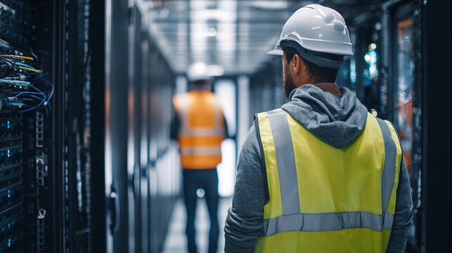 Focused Technician: A dedicated IT professional in a hard hat and safety glasses diligently works on a server rack