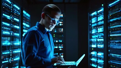 Server Room Technician, A focused male technician wearing glasses and a headset intently monitors rows of illuminated servers in a modern data center.