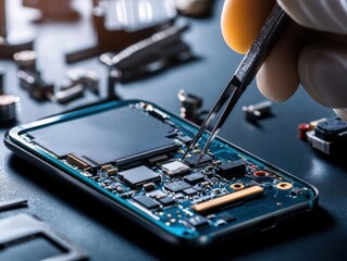 A man is working on a computer chip. Concept of precision and focus as the man carefully handles the delicate electronic components. The scene suggests that the man is a skilled technician or engineer