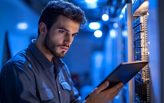 A young male IT specialist is shown configuring a server in a data center, focusing intently on the task at hand 8K , high-resolution, ultra HD,up32K HD