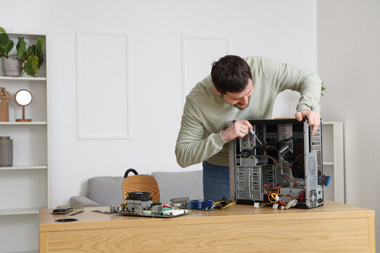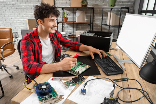 Technician Repairing Computer Systems Inside Modern Office Templates