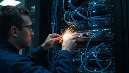 Young male technician server room data center network cable technology professional maintenance focused IT support modern equipment blue light secure environment working