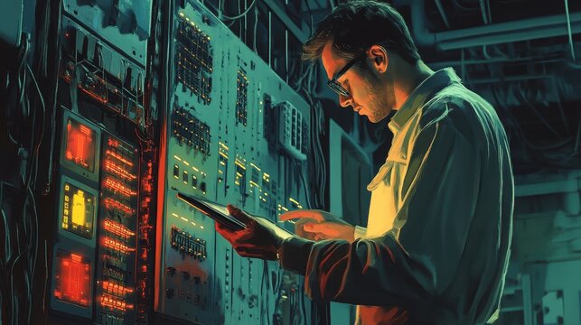 A technician in a data center appears stressed while troubleshooting server racks, indicating the challenges faced during technical problem-solving.
