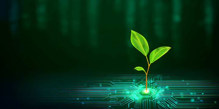Digital Growth: A vibrant green sprout emerges from a circuit board, symbolizing technological innovation and sustainable development.