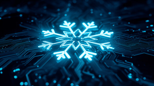 A glowing circuit board shaped like a snowflake, representing digital holidays and innovation