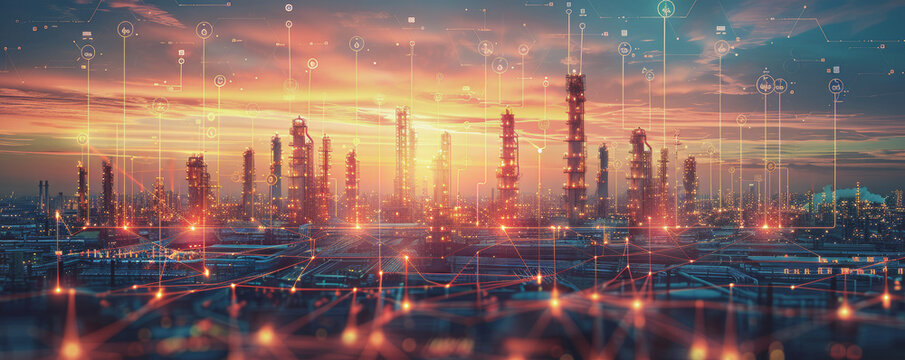 Futuristic industrial cityscape at sunset with digital network overlay. Towers and structures illuminated by vibrant lights and technological elements