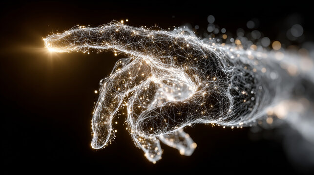 Digital hands reach out in a technological creation concept, featuring a glowing connection and representing innovation and futuristic design.