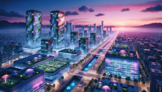 A digital metropolis embraces the future as skyscrapers reach towards the sky, crowned with lush greenery, while the sun sets on a landscape of technological marvels