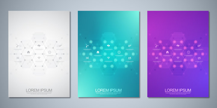 Template brochure or cover book, page layout, flyer design with technological background and flat icons and symbols. Concept and idea for innovation technology and communication.