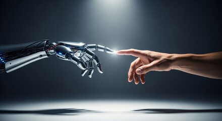 Human hand reaches towards a robotic hand in a futuristic lab setting, symbolizing technological advancement and human-AI collaboration.
