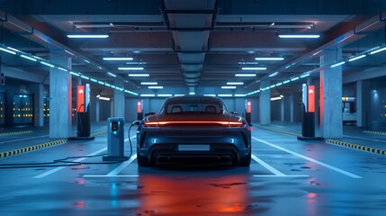 Futuristic Electric Car Charging Station in a Modern Parking Garage with Neon Lights