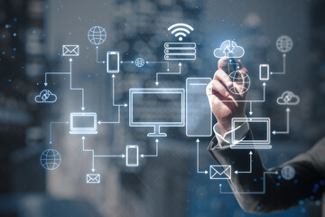 Cloud computing technologies concept with man hand using stilus on virtual touch screen with digital electronic devices connected between each other on blurred abstract background