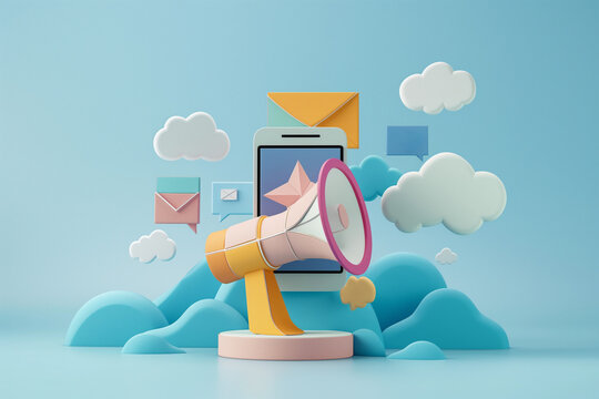 paper cut style of social marketing concept, megaphone, email, smartphone.