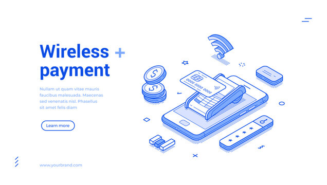 Wireless payment POS terminal online banking outline isometric web banner design template vector illustration. Internet e money cashless paying financial digital technology mobile app landing page